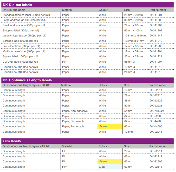 Nhiều kích thước nhãn có sẵn trong khuôn cắt (kích thước sẵn) và các cuộn có chiều dài liên tục và các vật liệu giấy và phim và có các màu trắng, vàng và trong suốt: