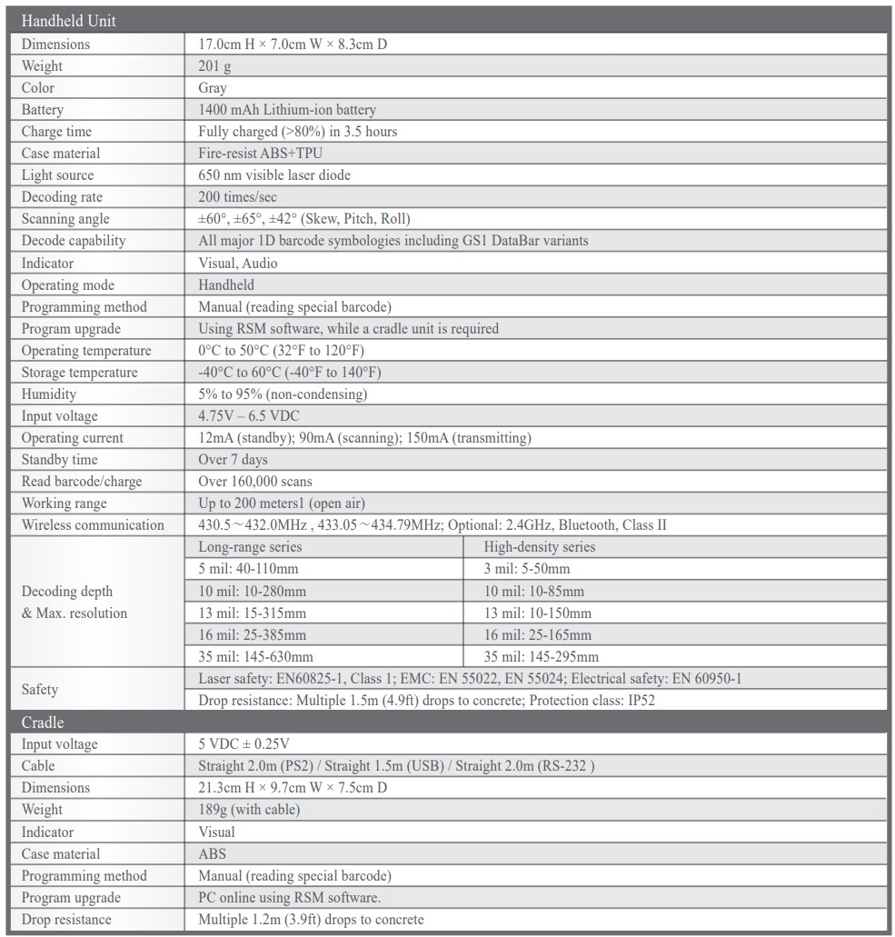 - Giải mã tất cả các ký hiệu mã vạch 1D chính bao gồm GS1 DataBar